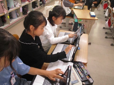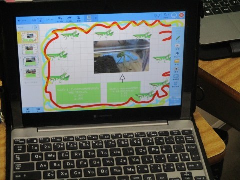 虫取りをして、その観察結果をグループで協力し、タブレット内でまとめていました。