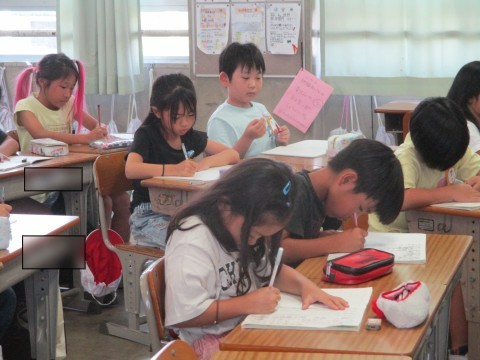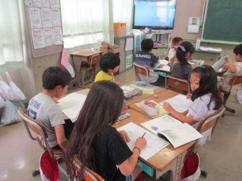 席替えをしました。新しい席順で座っています。ノートにしっかり自分の考えを書きこんだあとは,近くの仲間と対話です。