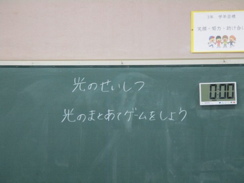 理科の授業です。光の性質をまと当てゲームを取り入れながら学習しています。鏡にも工夫がなされ、自分の反射の光がどれなのかが一目瞭然です。