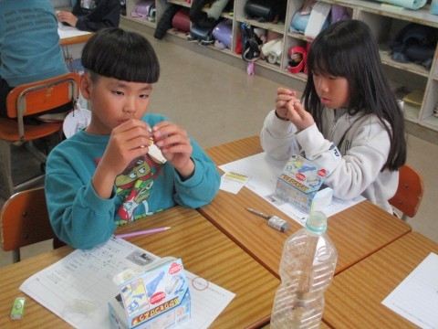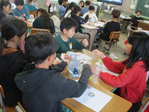 これまで学習してきた理科のワークシートをノートに張ります。学びの足跡をしっかり整理しています。