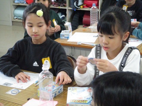 実験キットの部品を確認しながら,導線のつなぎ方にチャレンジします。