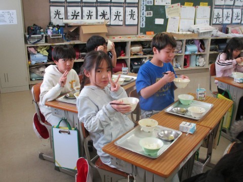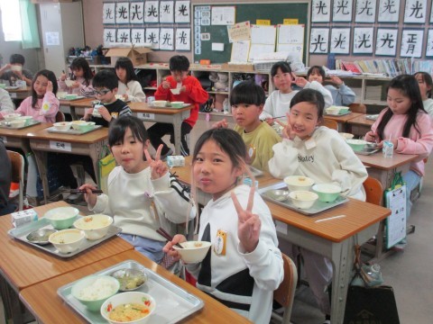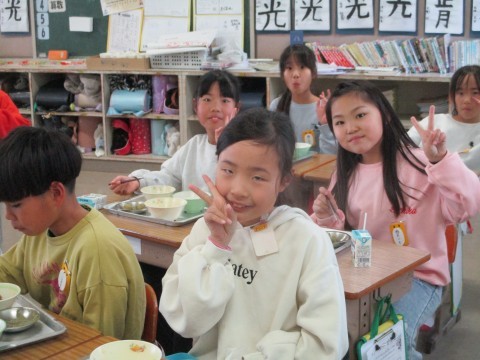 ピースサインがかわいい3年生。給食の時間も楽しい時間です。