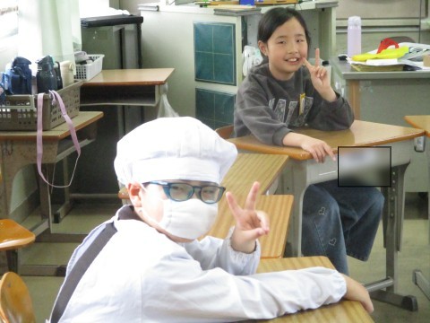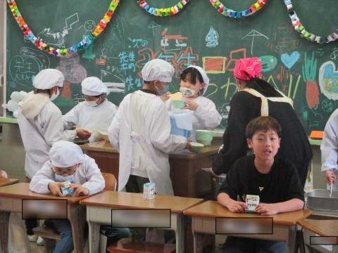 3年生の教室で過ごすのもあともう少し。担任の先生と一緒に給食タイムを楽しみます。