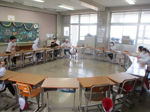 今日は3年生最後の給食の日。みんなで輪になって食べます。