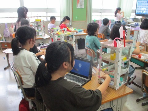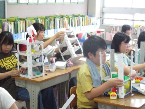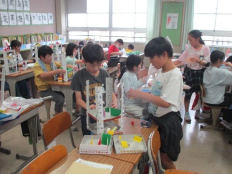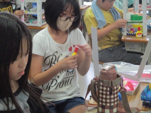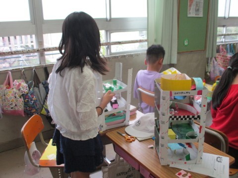 立体作品に挑戦しています。ボンドで柱をつけて…何階建てにできるかな?