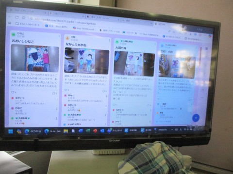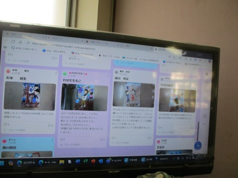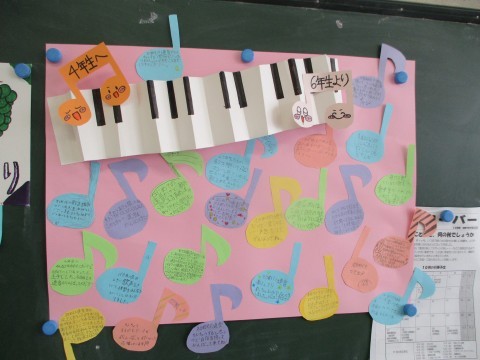 自分の描いた絵をタブレットに取り込んで,コメントをもらいます。かわいらしい音符のメッセージボードは6年生が連合音楽会に向けて激励のメッセージです。