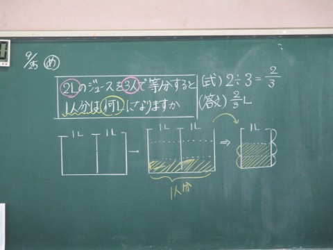 分数のわり算です。整数÷整数=分数で表す方法を考えています。図を描いて視覚的に理解する。先ずは基本の学習です。