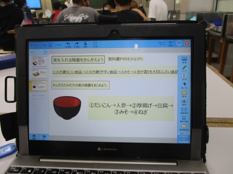 みそ汁の具を発表ノートに書きこんで発表しています。