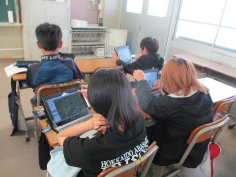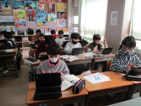 道徳の時間,郷土を大切にするこころを学んだあと,タブレットで堺について調べています。