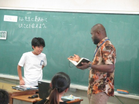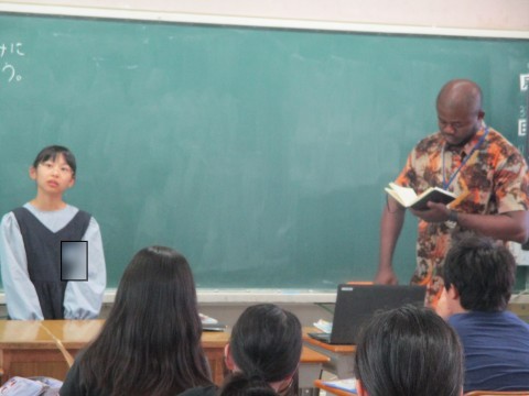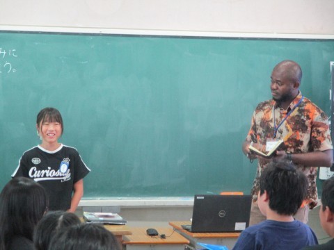 質問されて,なんと答えようかその場で考える場面。話すだけではなくて,ヒアリングの力や英作文の力も試されています。しっかり答えていました。