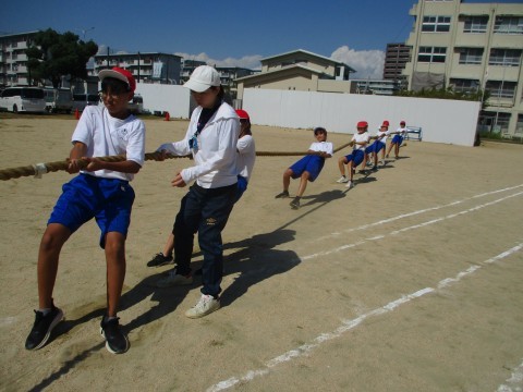 6年生は連合運動会に向けて綱引きの練習を始めています。調査班・分析班・実践班に分かれて力強く綱を引くことに挑戦しています。