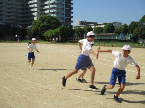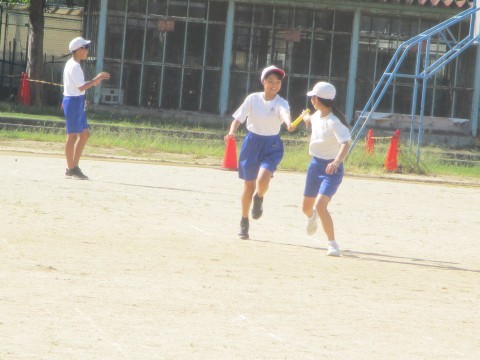 リレーのバトンパス練習。うまくバトンを繋げるか・・・