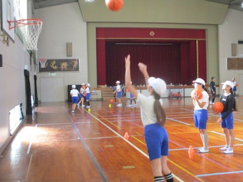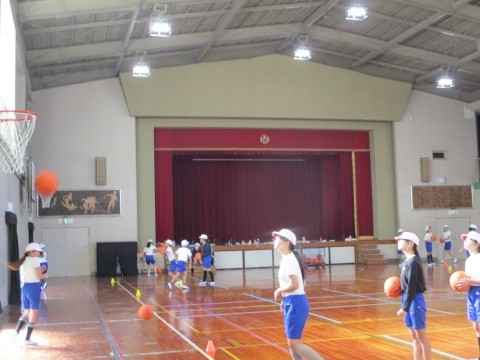 バスケットボールにチャレンジ中。シュート練習ではみんな真剣な表情。ゲームでシュート決められるといいね。
