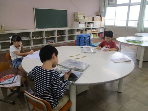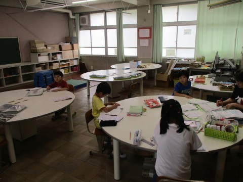 2年生の国語の学習で『スイミー』に取り組んでいます。海の中の世界を表現しています。窓際には七夕飾り織姫と彦星の折り紙が仲良く並んでいます。
