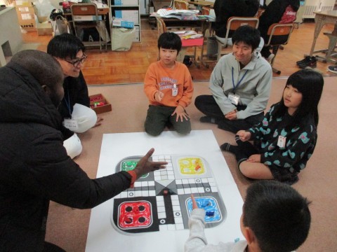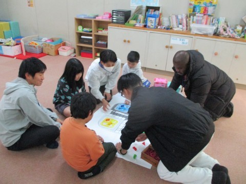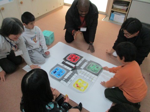 なかよしの教室でNSの先生と外国語でボードゲームをしています。