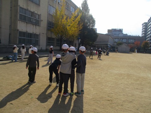 訓練のサイレンを聞いて、素早く自分を守る体勢をとる東っ子たち。