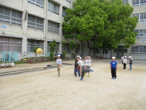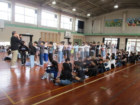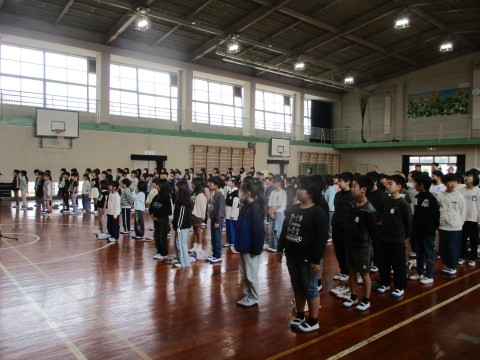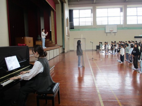 月曜朝会。時間の前には整列してしっかり静かに待つことができる東っ子です。校歌の歌声もやさしいく響いていました。