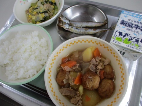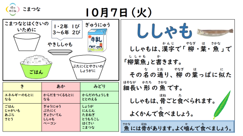 今日のメニューは…ししゃも『柳葉魚』と漢字で書くそうです。ししゃもの形が柳の葉に似ていることからつけられた漢字名
