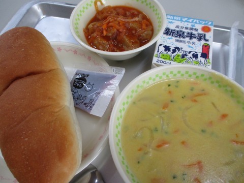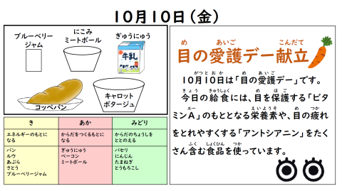 今日のメニューは…キャロットポタージュ,にこみミートボール,コッペパン と洋風メニューです。ブルーベリージャムがついて目の愛護デー献立になっています。