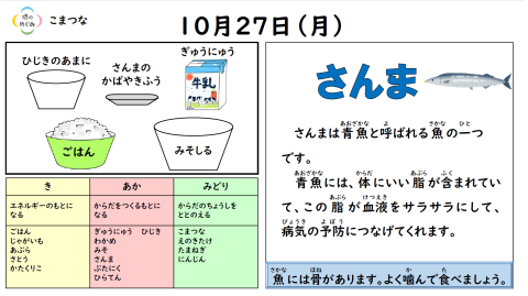 今日のメニューは…さんまのかば焼きふう。今年はサンマが豊漁だそうです。美味しくいただきます。