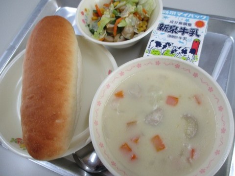 今日の給食は、ごはん、牛乳、ニラとうずらのスープ、鶏肉とサツマイモのピリカラ煮です。