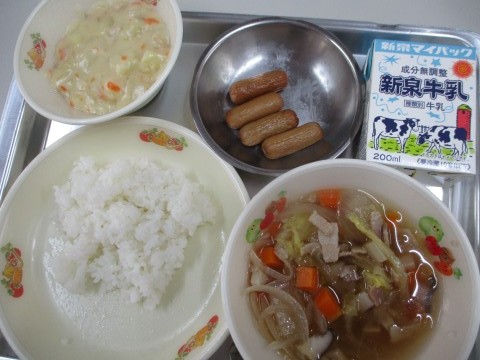 ミニパン・あげパン・牛乳・マカロニスープ・ミートビーンズです。