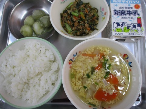 今日の給食は、ごはん、牛乳、さつま汁、てりやきハンバーグ、こまつなとはくさいのいためにです。