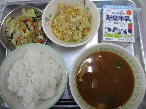 今日の献立は、ごはん、牛乳、田舎団子汁、はくさいとしろなのにびたし、まめかりんとうです。