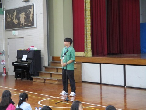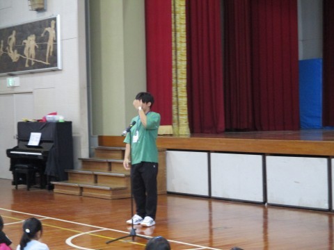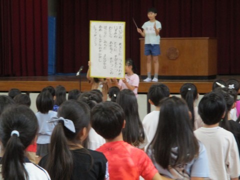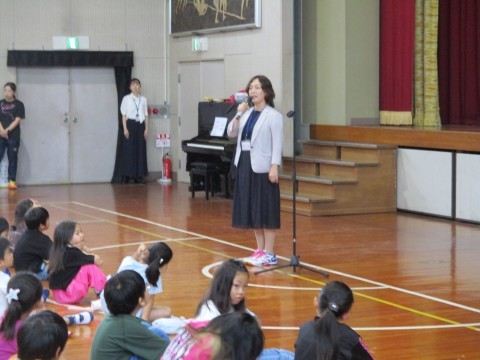 毎週きれいな歌声で児童朝会が始まります。校長先生は毎回「ありがとう」と児童のみんなにお話しています。それを聞くとまた一週間気持ちが落ち着いた今週が始まるなぁと思います。