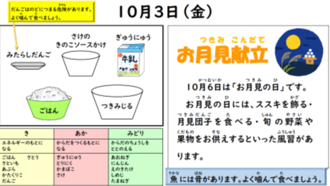 今日のメニューは…お月見献立。みたらし団子がお月見感を感じさせてくれます。