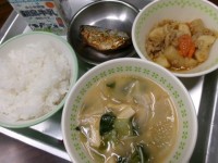 「おさつぱん、牛乳、ミネストローネ、とり肉のバーベキューソース」