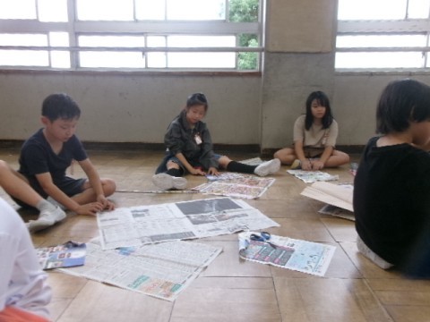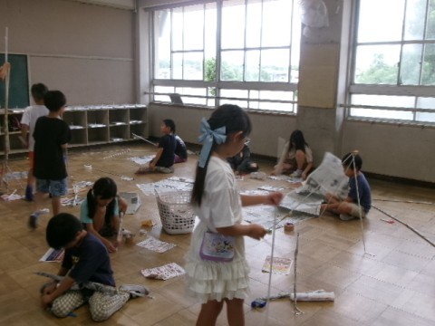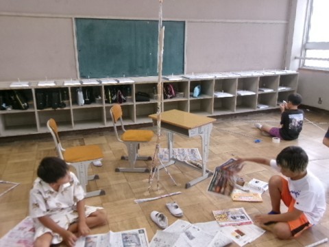 学年広場を広々と使って工作をしました。新聞紙や広告を細くより合わせて、棒を作り、テントのようなものを作ったり、高くつなぎ合わせて塔のようなものを作ったり、思い思いに取り組んでいました。
