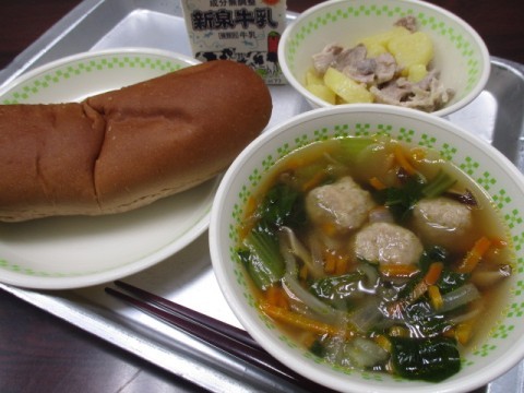 「ココアパン、牛乳、肉だんごスープ、豚肉のみそマヨガーリックいため」