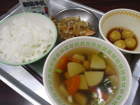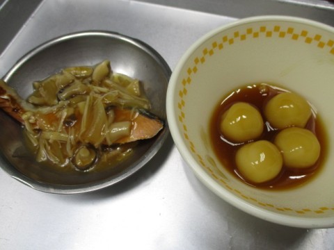 「ごはん、牛乳、月見汁、鮭のきのこソースかけ、みたらしだんご」