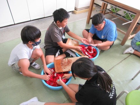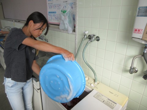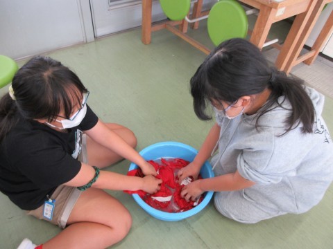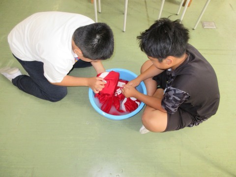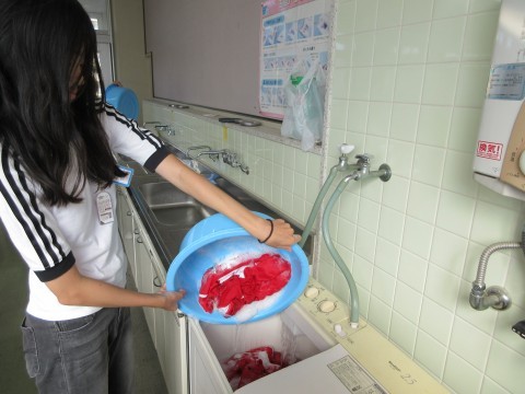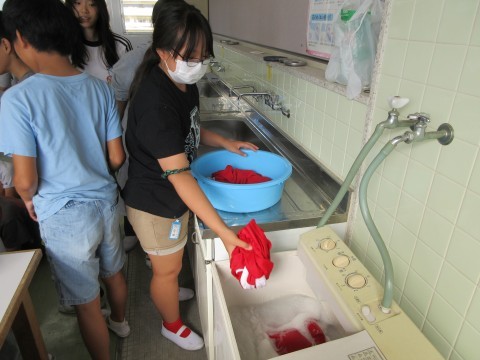 連運で使ったユニホームを洗濯しました。汚れやすいところを手洗いして,洗濯機で洗濯しました。前回はしぼるのに苦労しましたが,洗濯機での脱水後の手触りに驚いていました。