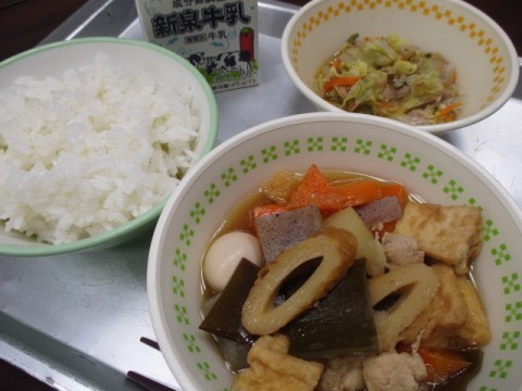 「ごはん、牛乳、こんぶ入りおでん、白菜のおひたし」