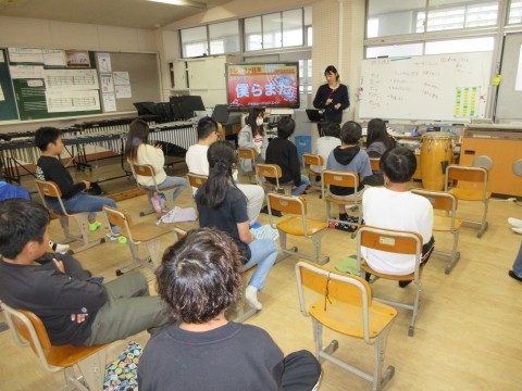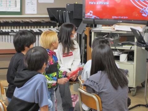合奏の曲を話し合いました。音楽を聞くと,自然に体が動き出す子たちも。「かっこいい曲がいい」という意見が多かったです。