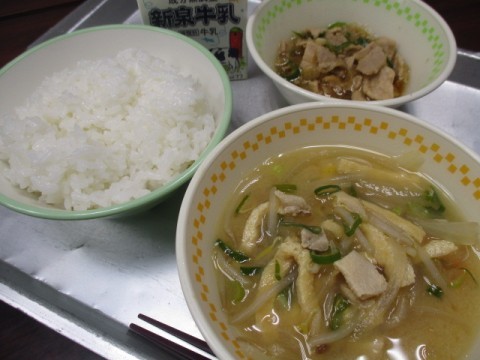 「ごはん、牛乳、ちゃんこ汁、豚肉のしょうが炒め」