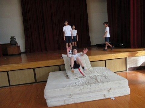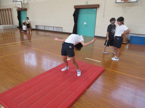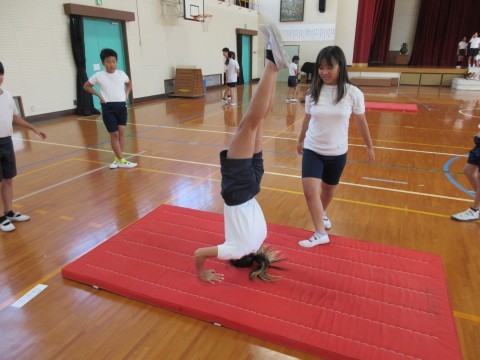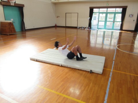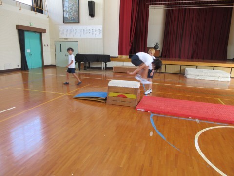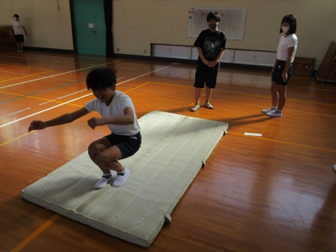 「もっと大きく美しく跳ぼう」を目標に,とび箱を使って学習しています。今日は「抱え込み跳び」や「首はね跳び」につながる運動をしました。
