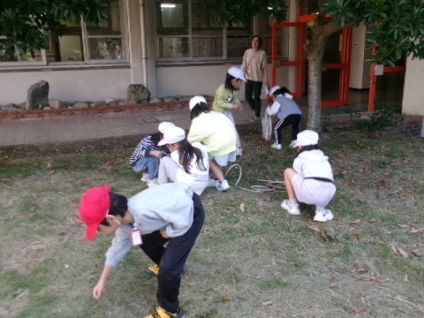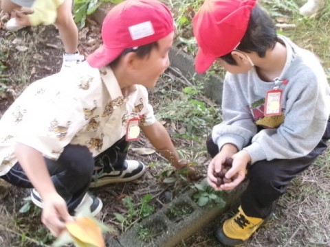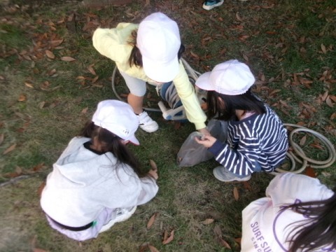 学校の中で、落ち葉やどんぐりをみつけて集めました。