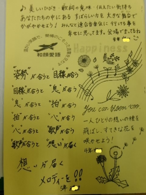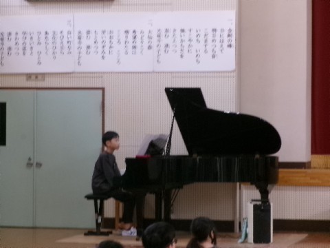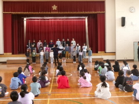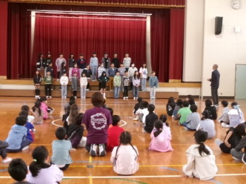 明日の本番の前に、全校児童の前ですばらしい歌声を披露しました。全員が真剣に聞き入っていました。「明日も120%の力を出せるよう、自信をもって臨んでください」とエールが送られました。