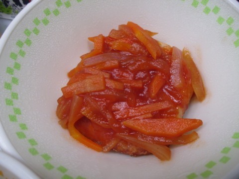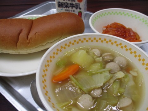 「黒糖パン、牛乳、スープ煮、とうふハンバーグ野菜ソース」