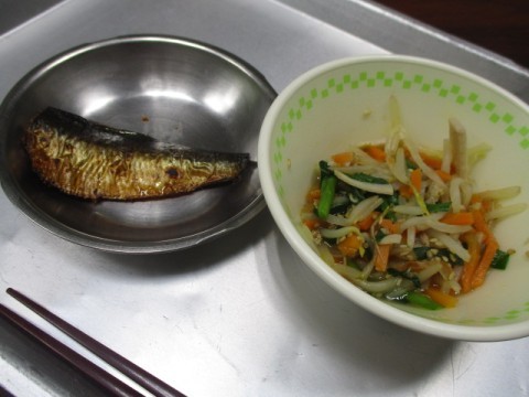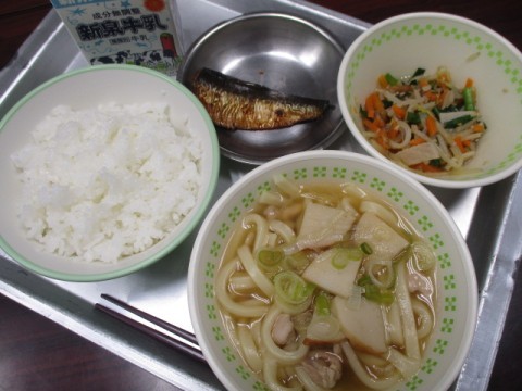「ごはん、牛乳、鶏なんばんうどん、いわしのみりん干し、もやしのごま風味」