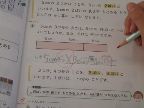 3つ分、4つ分を3倍(ばい)、4倍・・・。  何ばいの長さをもとめるときも、かけ算が使えるよ。