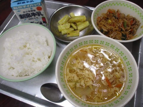 「ごはん、牛乳、たまごスープ、ビビンバ風、さつまスティック」