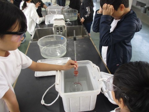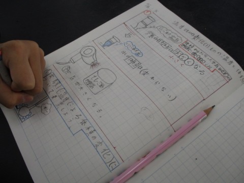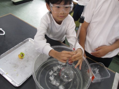 フラスコを温めたり、冷やしたり。 ガラス管の中のゼリーの動きを確かめます。