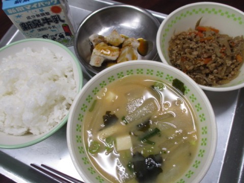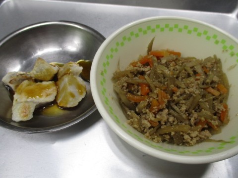 「ごはん、牛乳、みそ汁、セルフごぼうごはん、里いもの照り焼き」