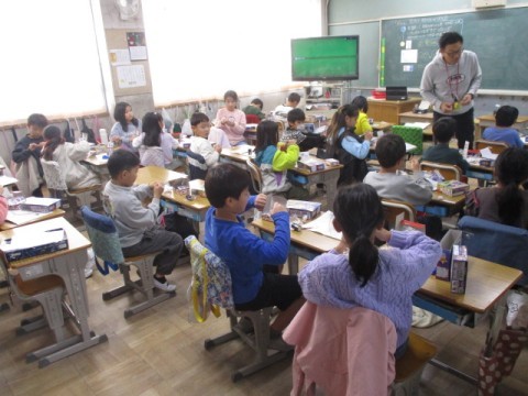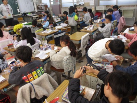 教材キットを使って実験です。 「ビニール銅線を爪(つめ)の先でむく(はがす)」のが、むずかしいようです。