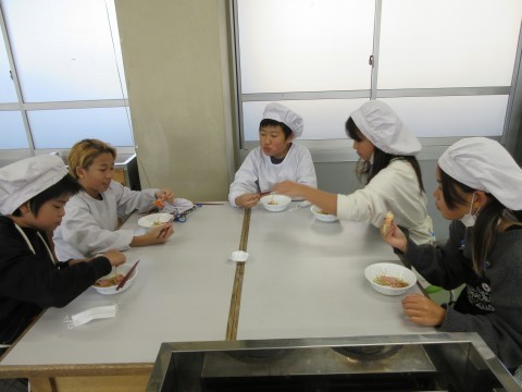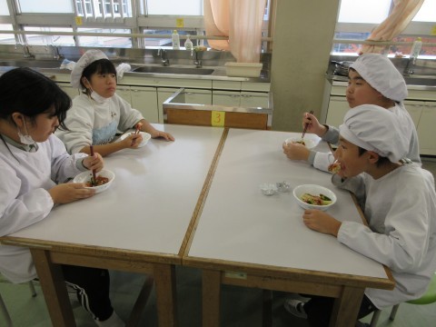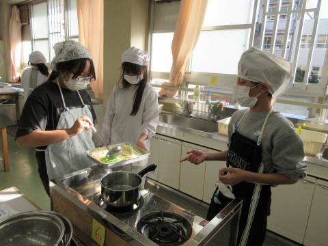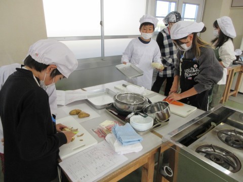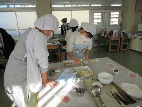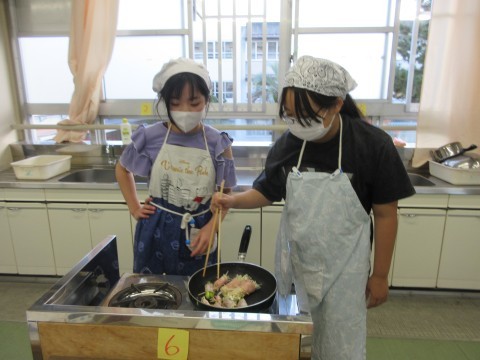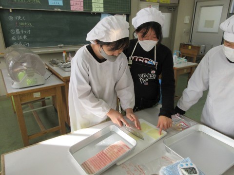 調理実習で「野菜のベーコン巻き」を作りました。切り方や下ゆでの仕方など,自分たちで調べて取り組みました。とてもおいしくできました。