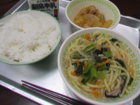「ごはん、牛乳、小松菜タンタン麺、鶏肉の照り煮」